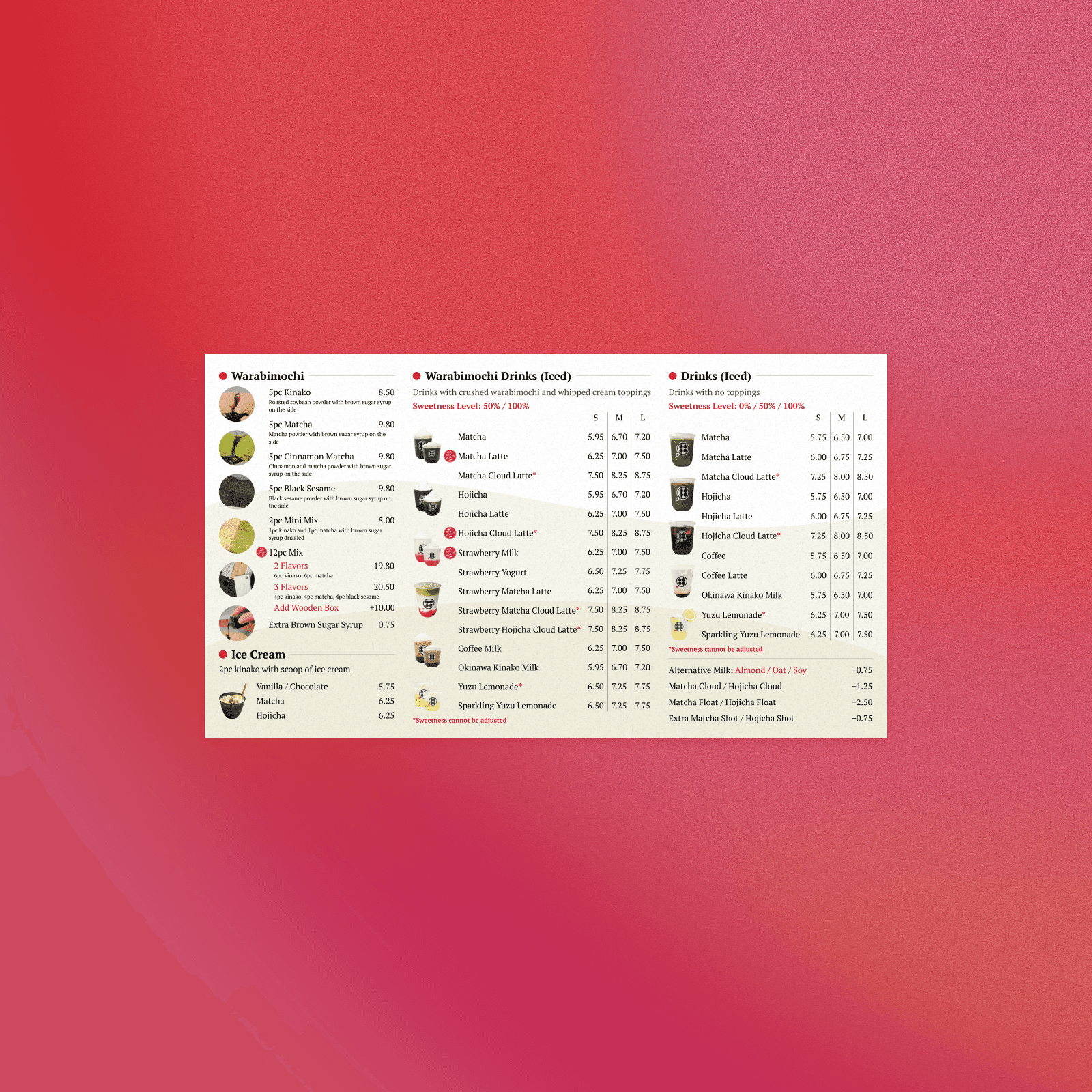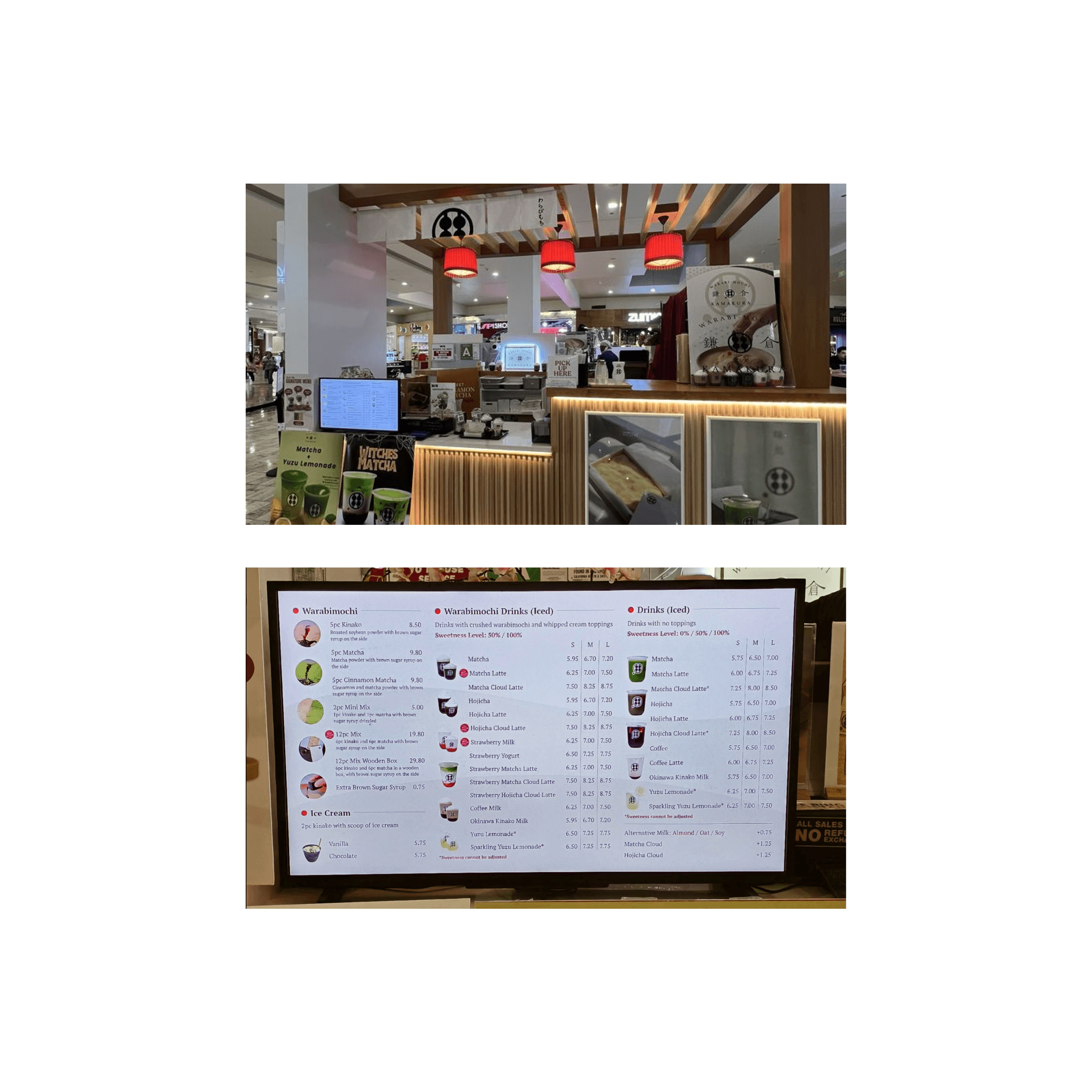 Warabimochi Kamakura's first U.S. location opened its doors in October 2024. As its menu expanded to include new warabimochi flavors and drink offerings, I helped design a new storefront display menu with Kanmidokoro Kamakura's existing branding.